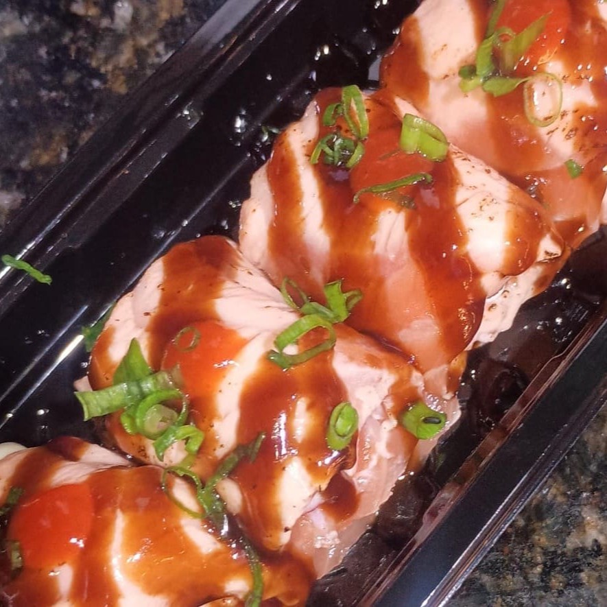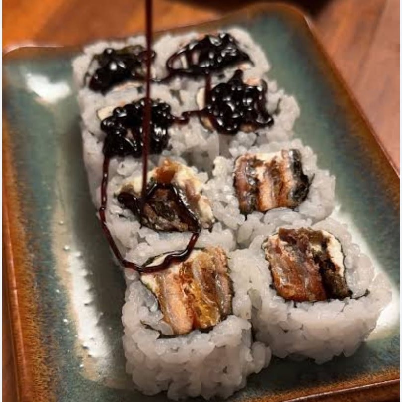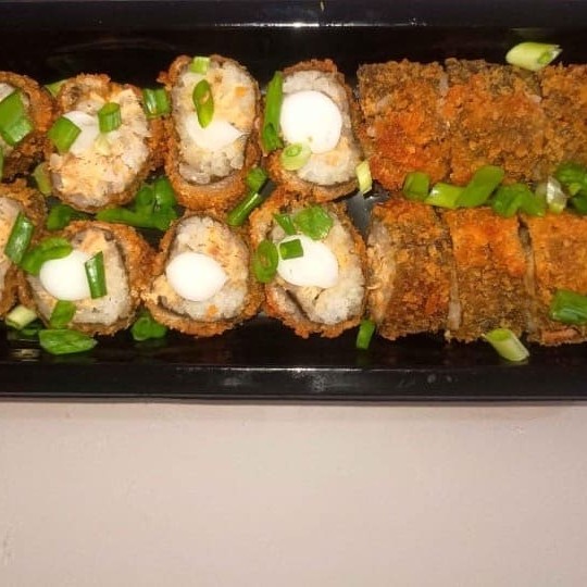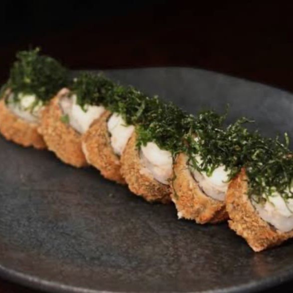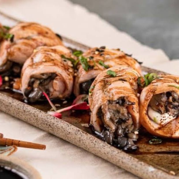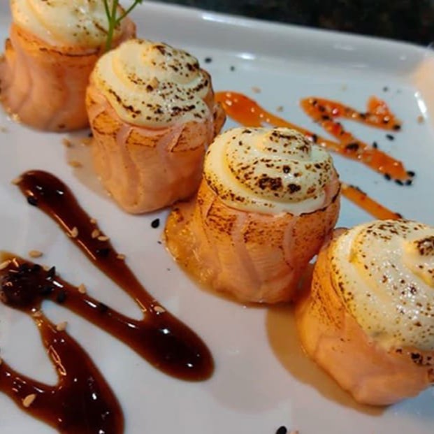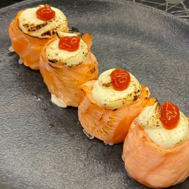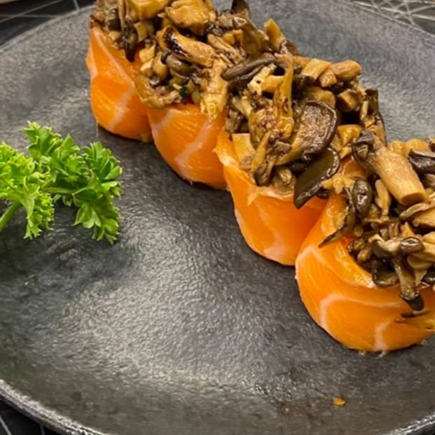 Roll de shimeji : salmao,creme shese e shimeji ,maçaricado com teriaki pimenta e cebolinha