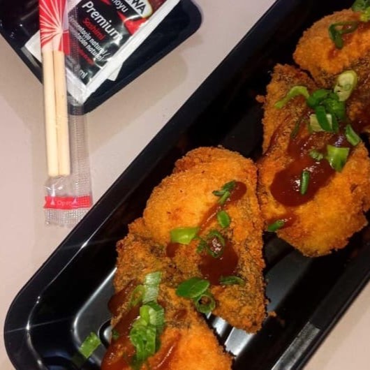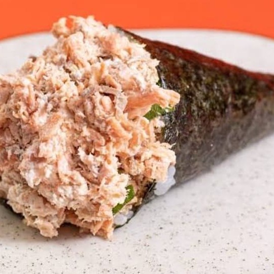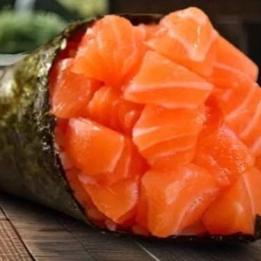 4 mini temaki arroz,salmão grelhado,empanado e frito finalizado com teriaky da casa