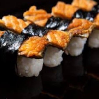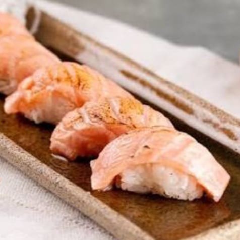 6 niguiri salmão maçaricado: arroz , salmão fresco e levemente maçaricado