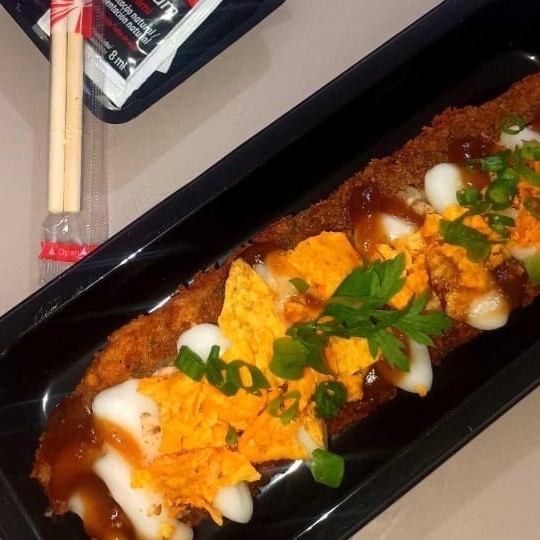 Temaki Filadélfia hot : arroz ,salmão ,creme shese,cebolinha, empanado e frito