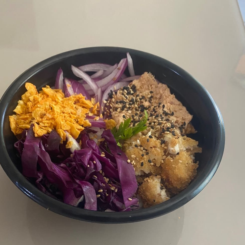 Poke de tilápia empanada e frita , Doritos,salmão grelhado ,repolho roxo, cebola roxa ,base de arroz finalizado com gergelim .