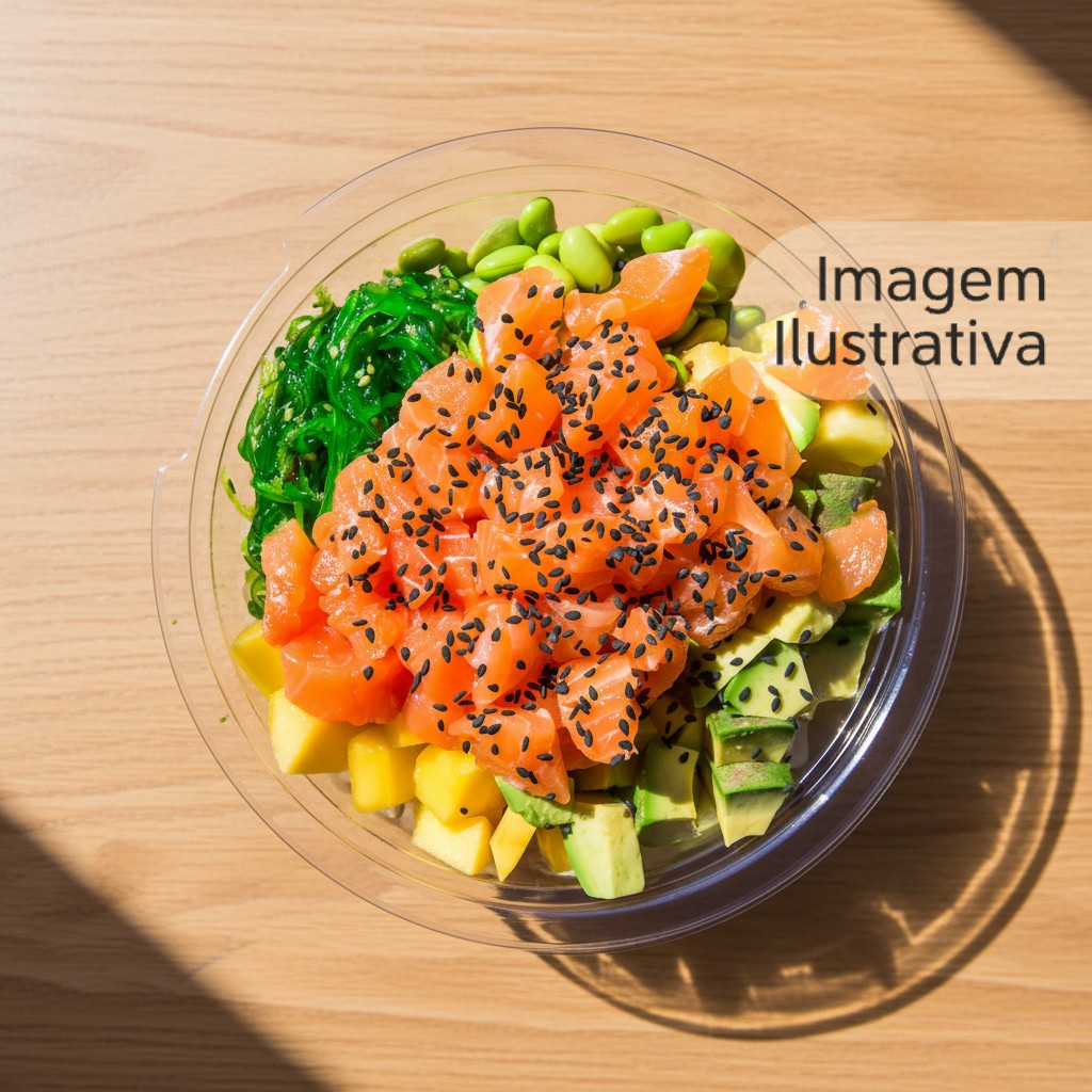 BASE DE ARROZ, SALMAO EM CUBOS MAÇARICADO, MANGA ,COUVE ,KANI,CEBOLA, MOLHO DA CASA E GERGILIN