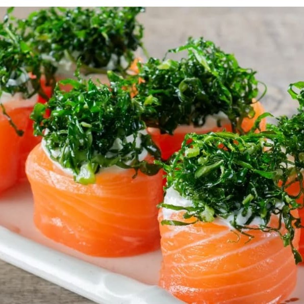 BASE DE ARROZ , LAMINAS DE SALMAO , SUNOMONO,COUVE, CEBOLA ,REQUEIJAO ,MOLHO DA CASA