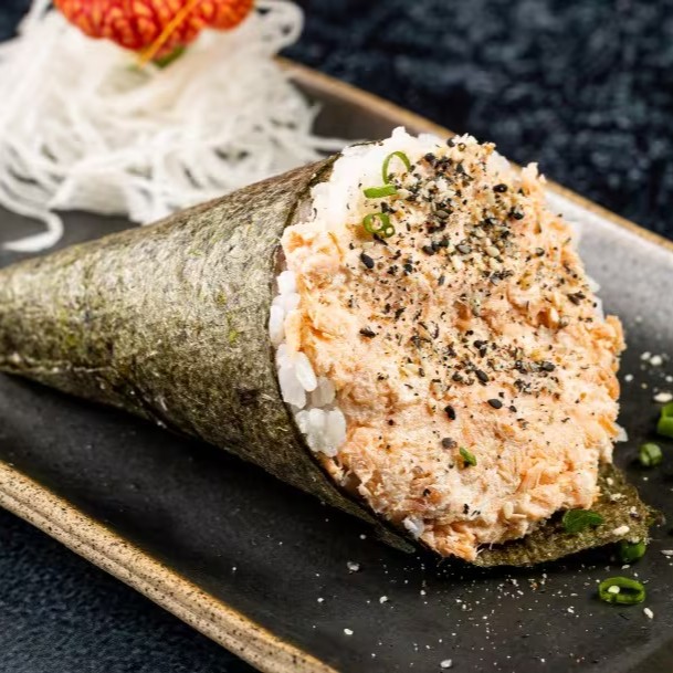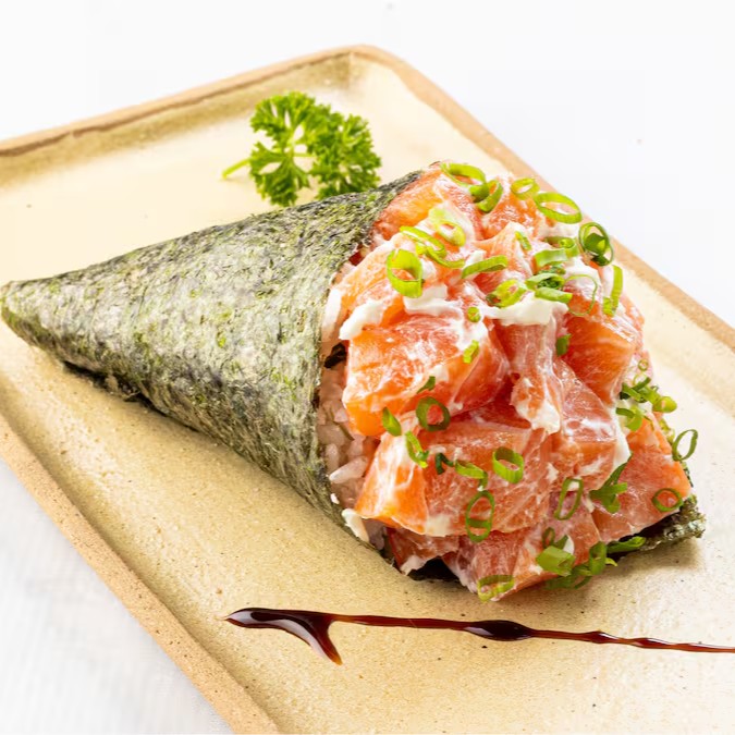 Cone de Alga Nori Recheado com Salmão, Cream Cheese, Cebolinha e Arroz Gohan.