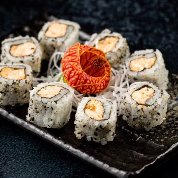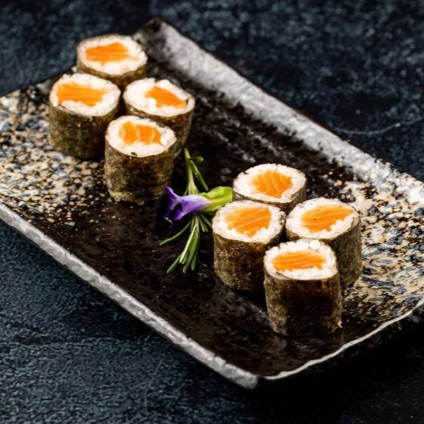 Roll de Arroz Gohan com Gergelim e Alga Nori com Recheio de Salmão Grelhado.