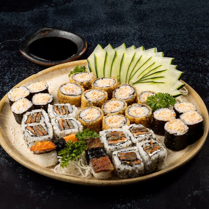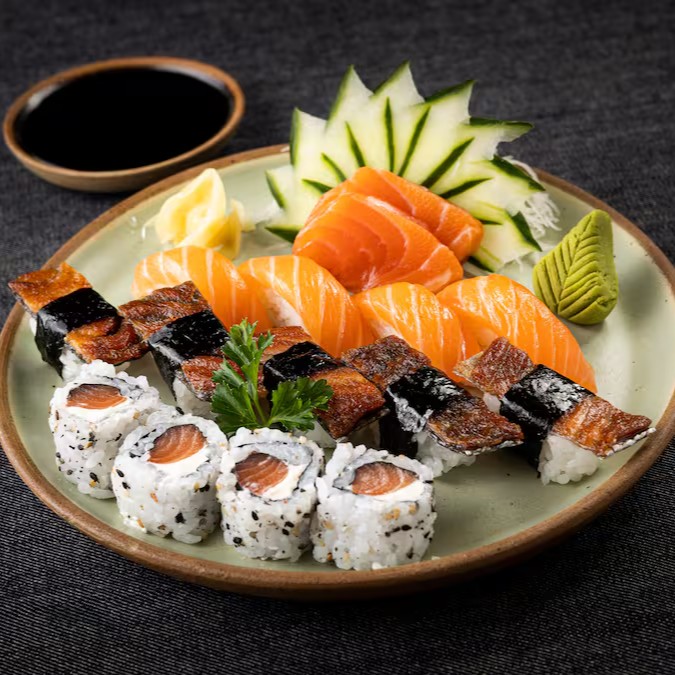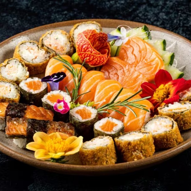 20 Maki Hot Filadélfia, 2 Sushis de Salmão, 8 Uramaki Skin, 8 Sakemaki e 4 Sushis Skin.