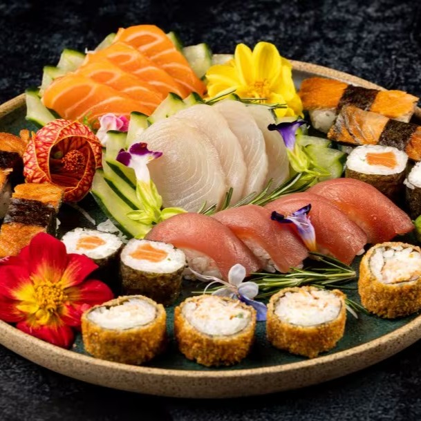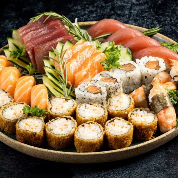 3 Sashimis de Salmão, 3 Sashimis de Atum, 4 Sushis de Salmão, 4 Sushis de Atum, 4 Sushis de Camarão, 4 Uramakis Filadélfia e 10 Hot Makis Filadélfia.