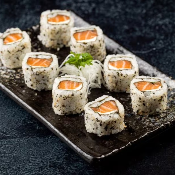 Roll de Arroz Gohan com Gergelim e Alga Nori com Recheio de Cream Cheese e Salmão.