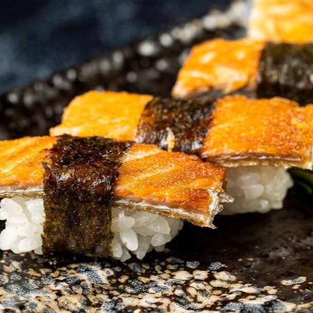 Niguiri de Pele de Salmão Grelhada - Arroz Gohan Coberto por Fatia de Pele de Salmão.