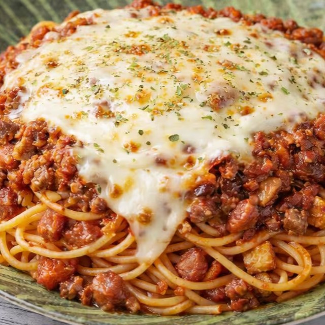 Macarrão ao molho artesanal bolonhesa e queijo.