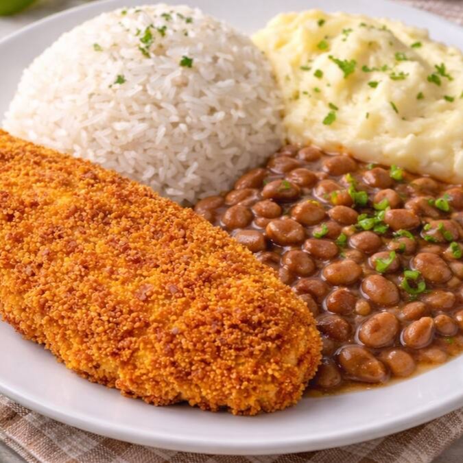 Acompanha arroz branco, feijão tradicional e farofa caseira.