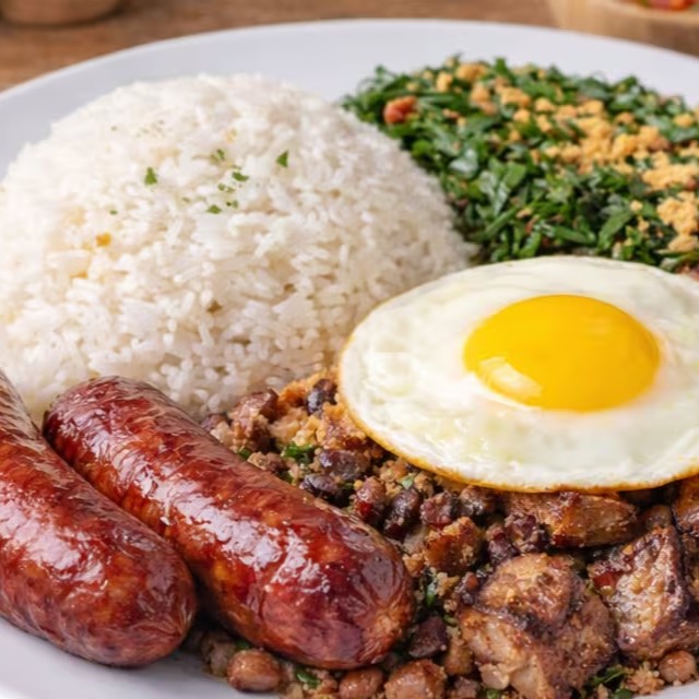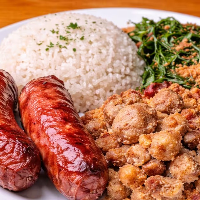 Acompanha arroz branco, feijão tropeiro, couve, ovo e 2 linguiça de churrasco.