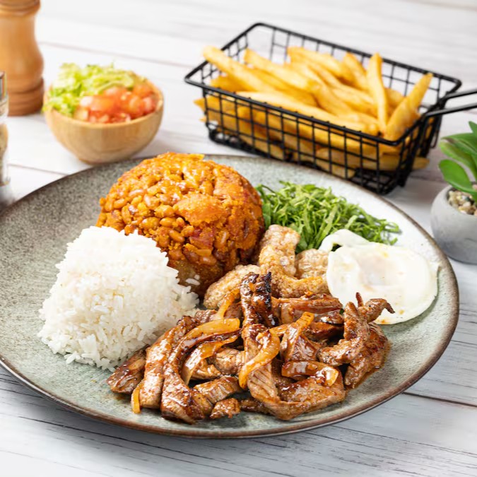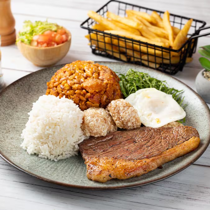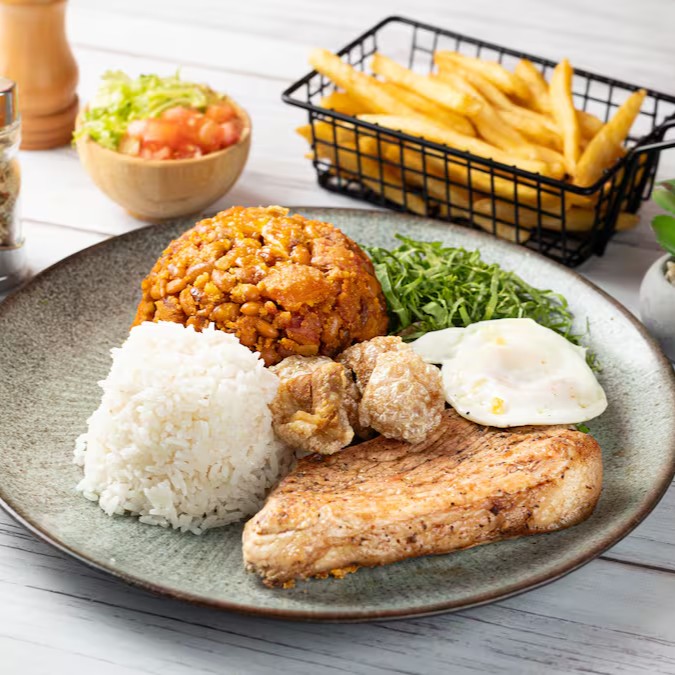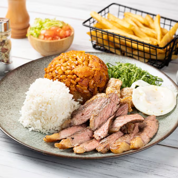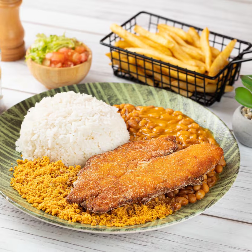 Acompanha batata frita crocante, vinagrete fresquinho, farofa, arroz branco soltinho e feijão caseiro.