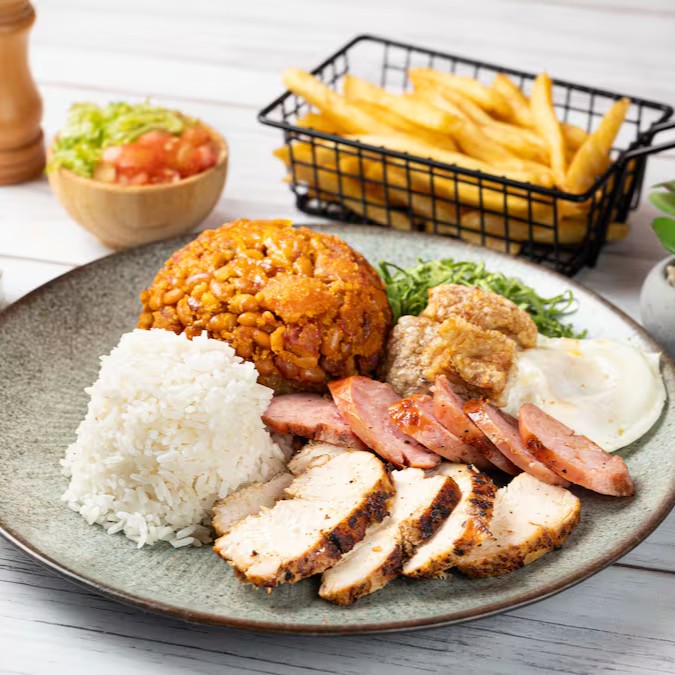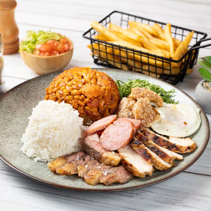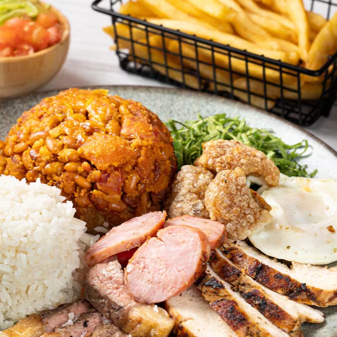 Acompanha arroz, tropeiro completo, batata frita e churrasco misto.