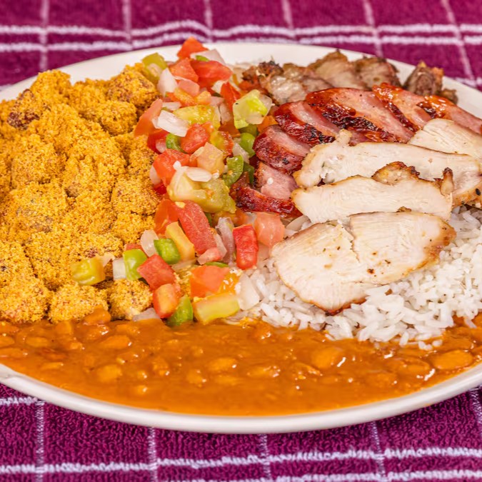 Acompanha arroz, tropeiro completo e churrasco misto de contra filé, peito de frango e linguiça de pernil.