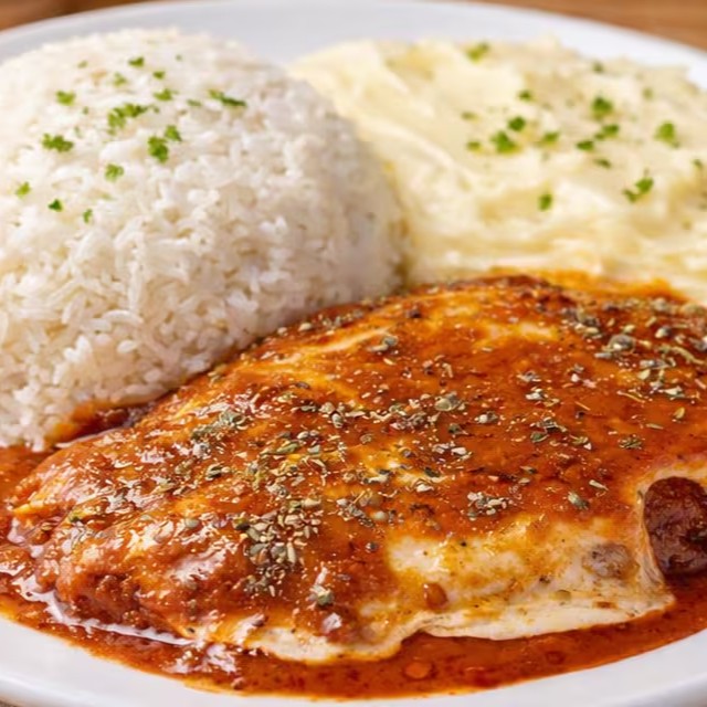 Acompanha arroz, feijão e purê de batatas.