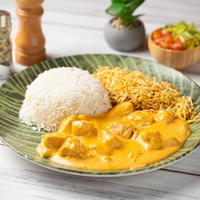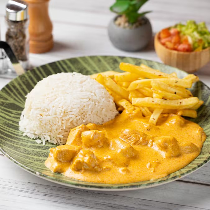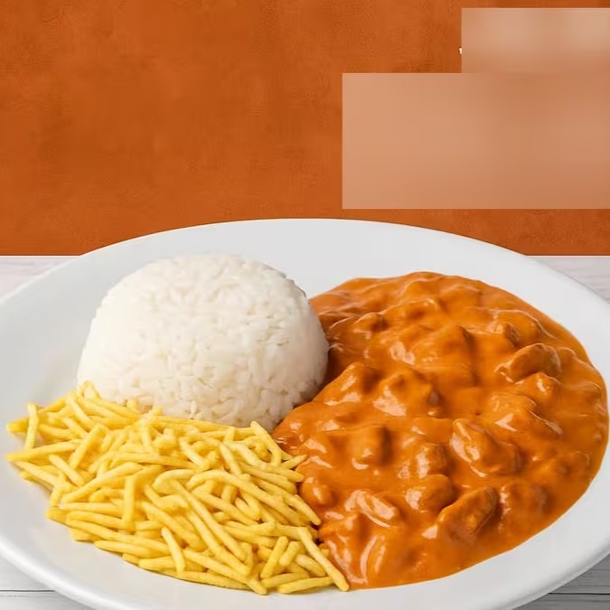 Acompanha arroz, strogonoff de frango cremoso e batata palha crocante.