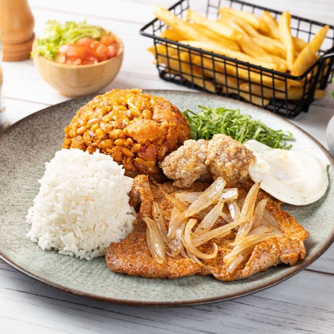 Acompanha arroz, tropeiro completo e contra filé acebolado.