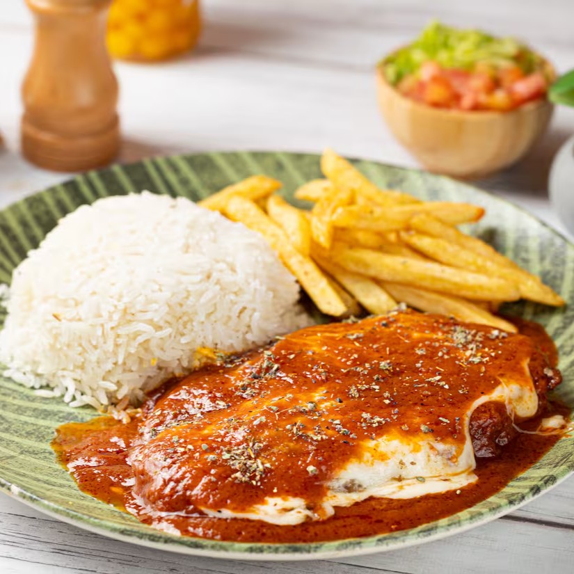Uma deliciosa parmegiana com molho artesanal e queijo. Acompanha arroz branco e purê de batata ou batata frita. Vale muito a pena experimentar.
