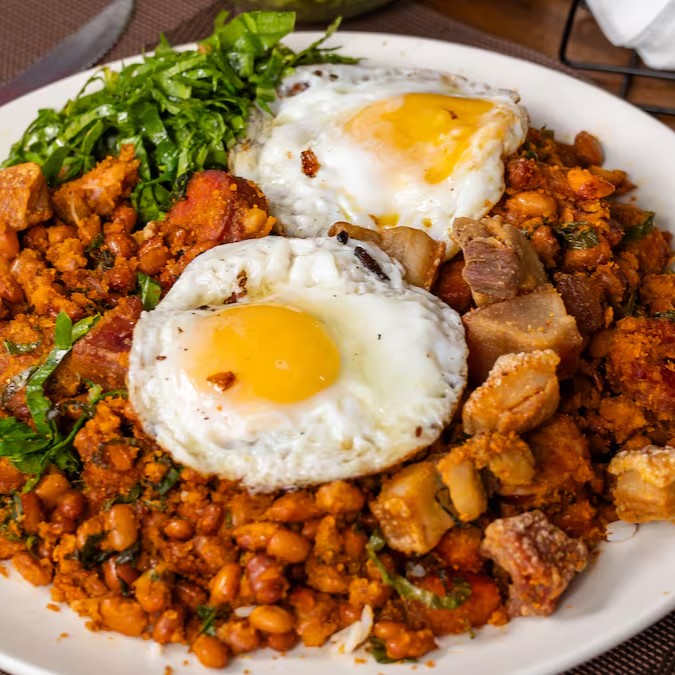 Delicioso Tropeiro com bacon, linguiça defumada bem molhadinho e torresmo crocante.