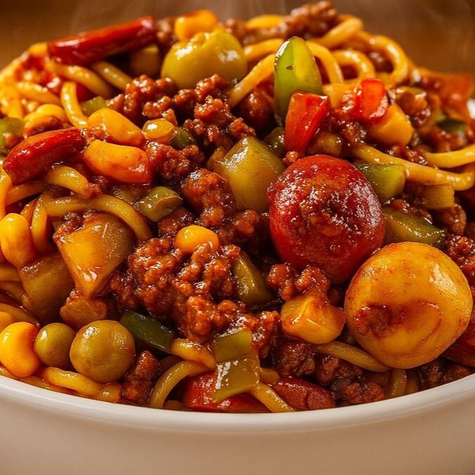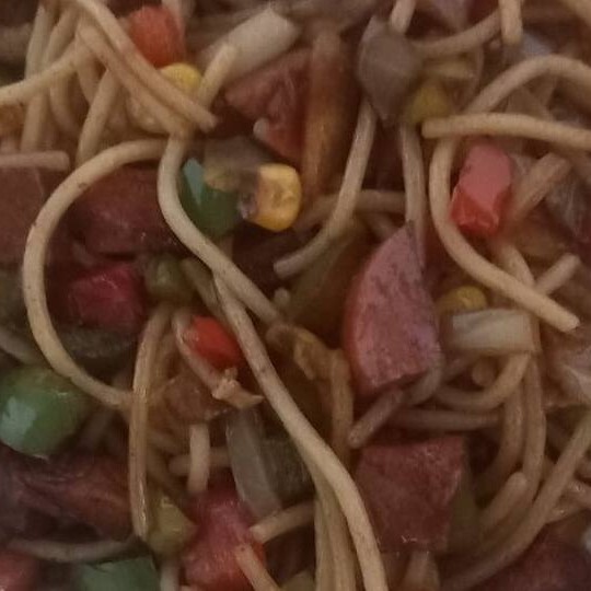 Espaguete, carne moida. musšarela, azeitona, milho e calabresa.