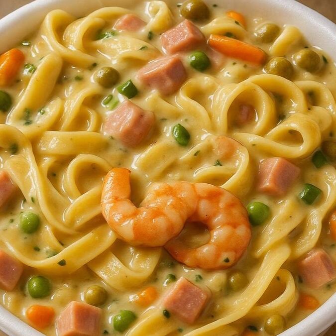 macarrão talharim ,camarão , cebola, alho , milho , ervilha, requeijão.