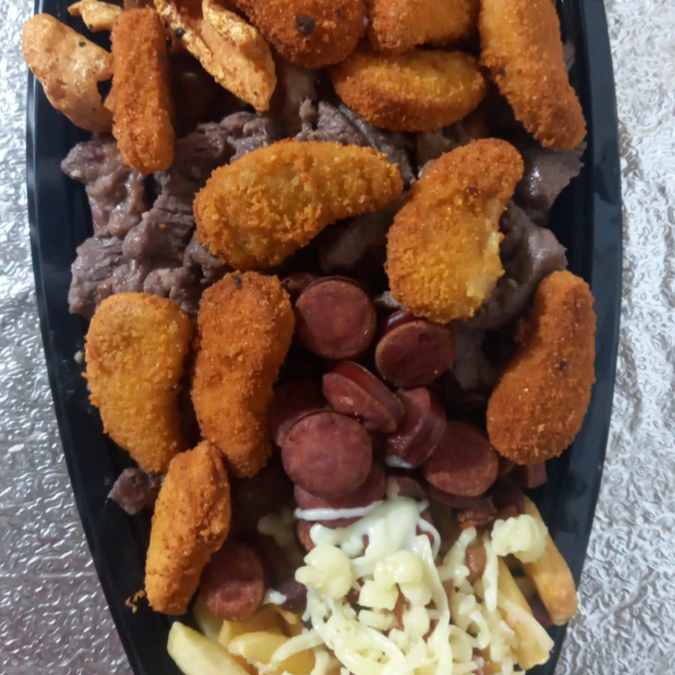 carne de porco ,carne de boi, carne de frango, liguiça , nugget , batata frita , mussarela , bacon e torresmo.