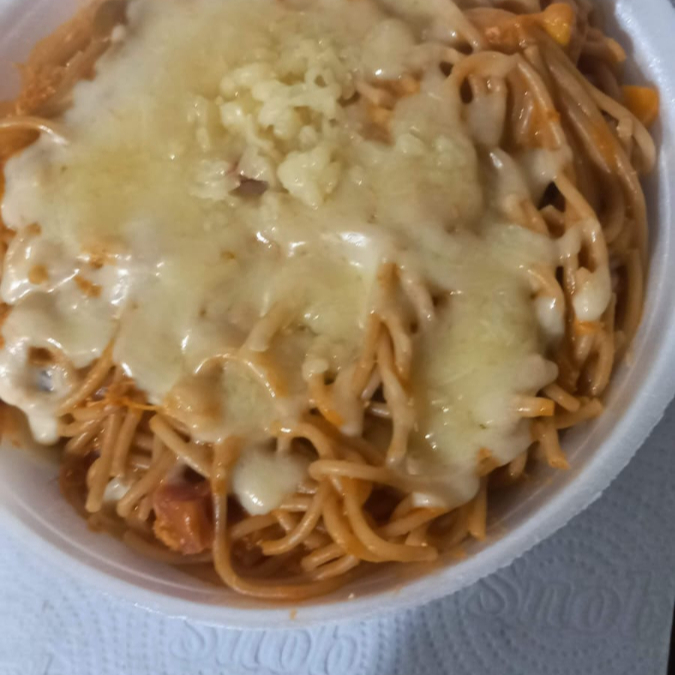 Espaguete, peito è franoo desfiadò, creme de leite, bacon, mussarela, āzeitona, milho, calabresa.