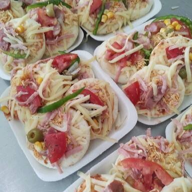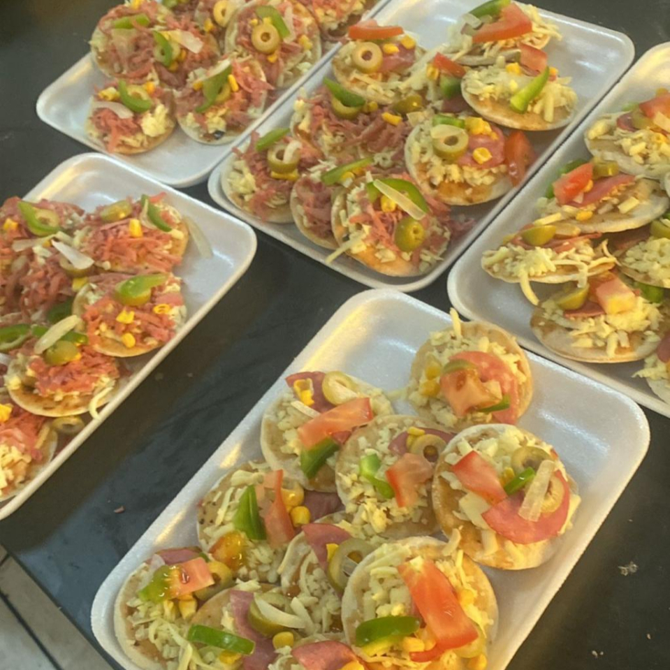 Bandejas mistas de mini pizza com os seguintes sabores: Presunto, Frango, Calabresa. Mini pizza pré-assadas Cebola, Pimentão, Queijo e Molho de tomate.