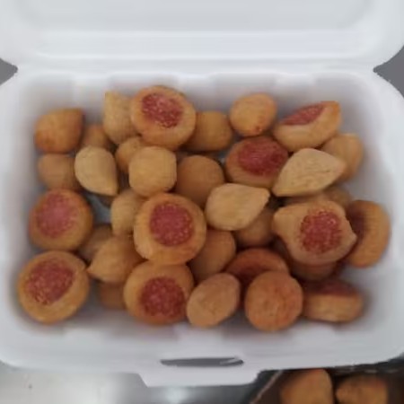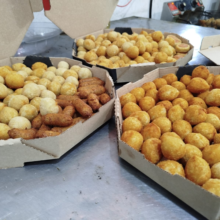 coxinha , Rissole de pizza, Rissole de calabresa,Bolinha de alho Bolinha de milho ,Bolinha de queijo ,Quibe ,Enroladinho de salsicha enviamos um pouco de cada MAIS OU MENOS UNS 4 SABORES