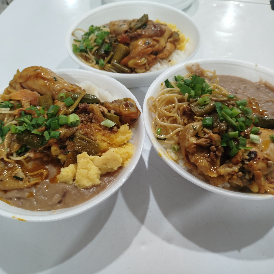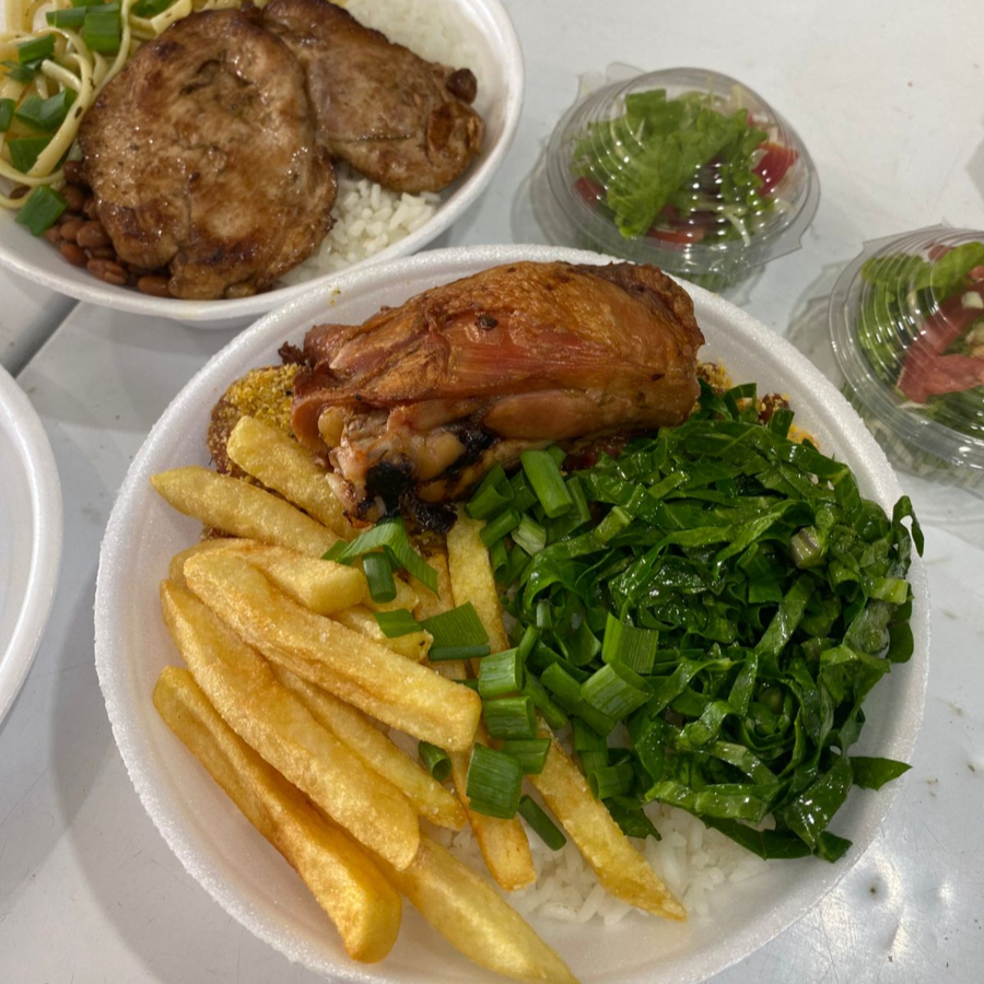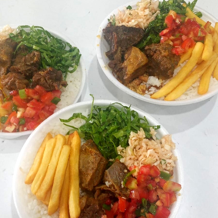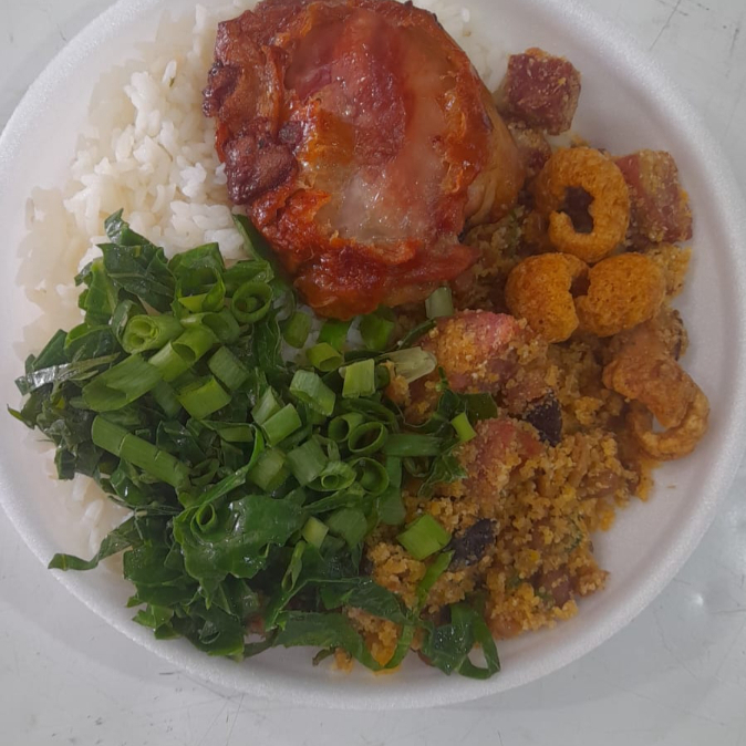 Arroz, feijão refogado, macarrão, salada 1 carne