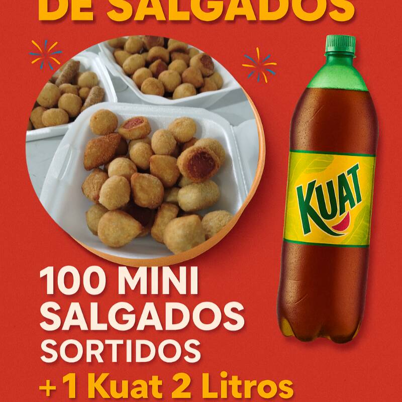 100 Mini Salgados Sabores Misto + 1 Kuat 2 Litros