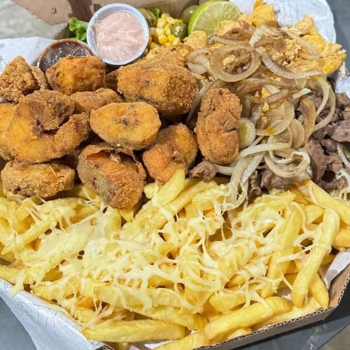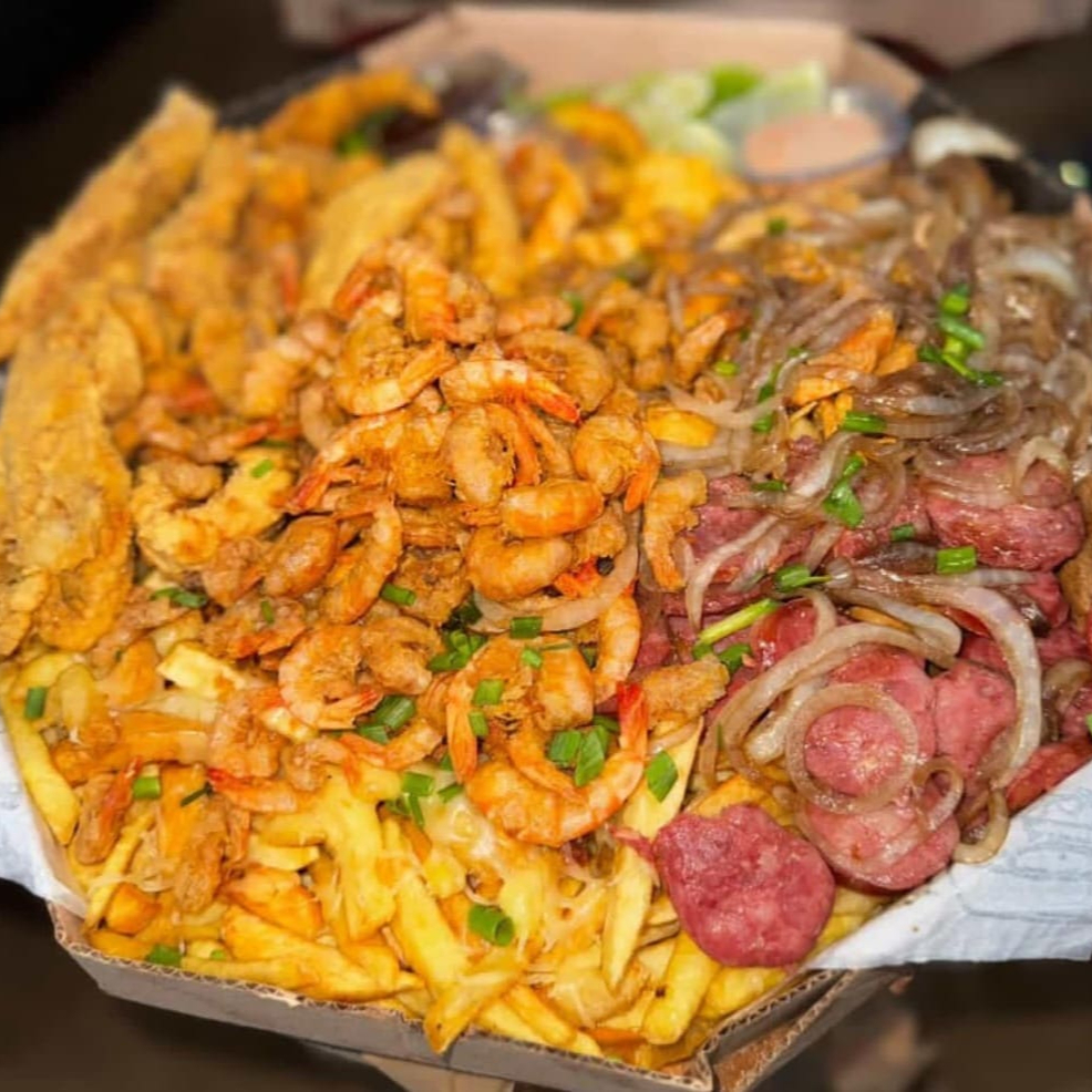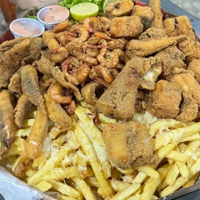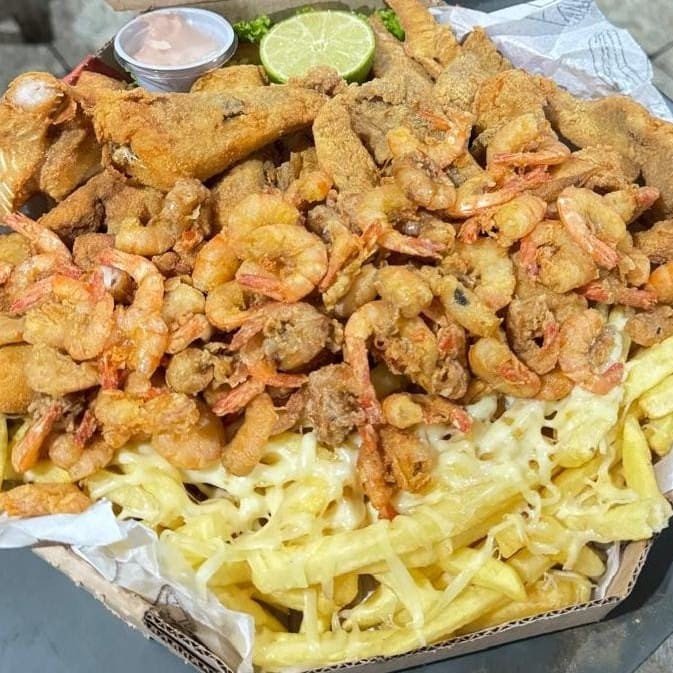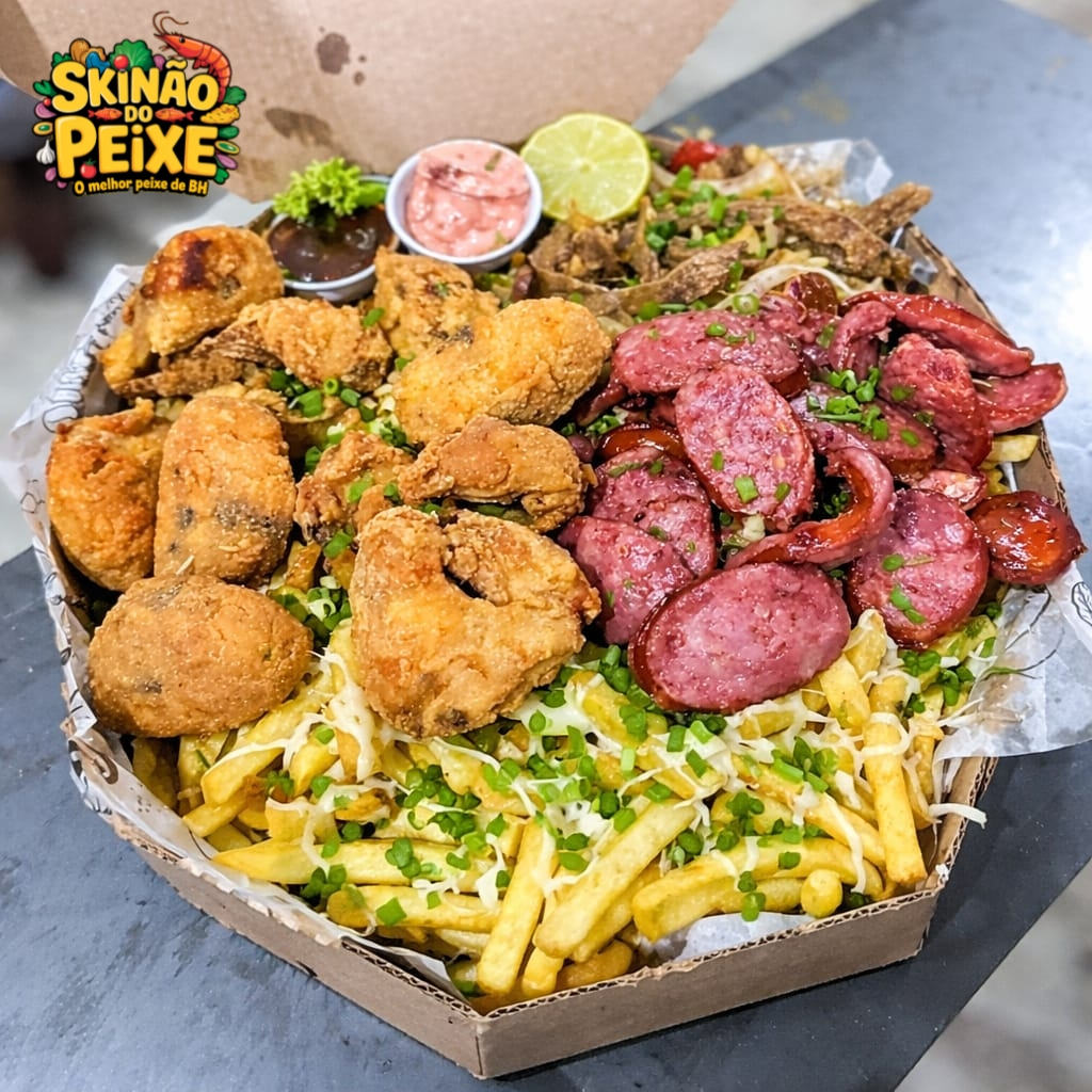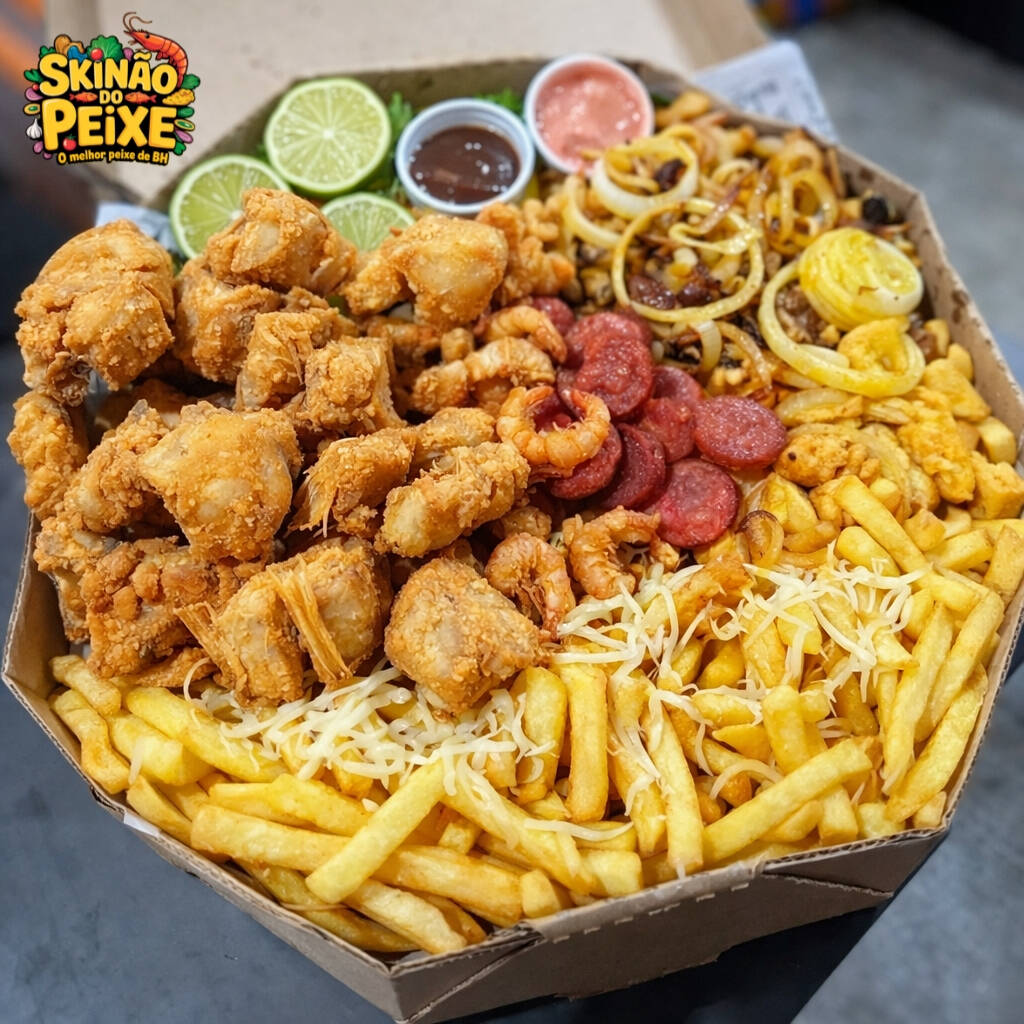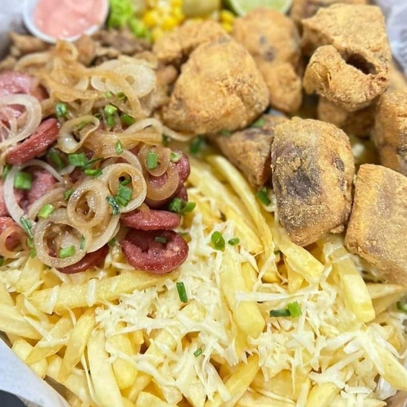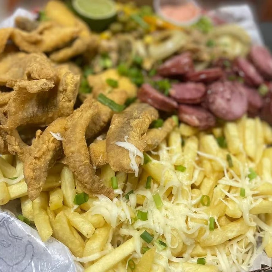 Cascudo Empanado, Camarão Empanado, Contra Filé Acebolado, Linguiça Calabresa, Lombo Acebolado, Frango Acebolado, Fritas com Queijo Muçarela, Salada, Molho Barbecue e 2 Molhos da Casa + Bacon Grátis