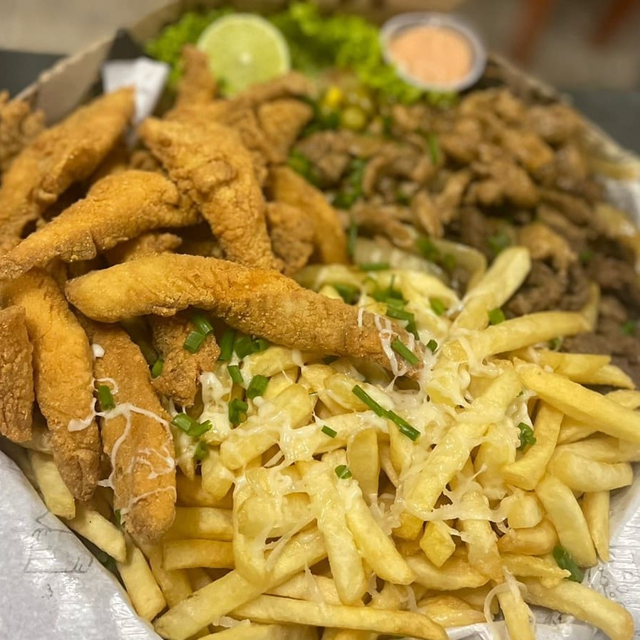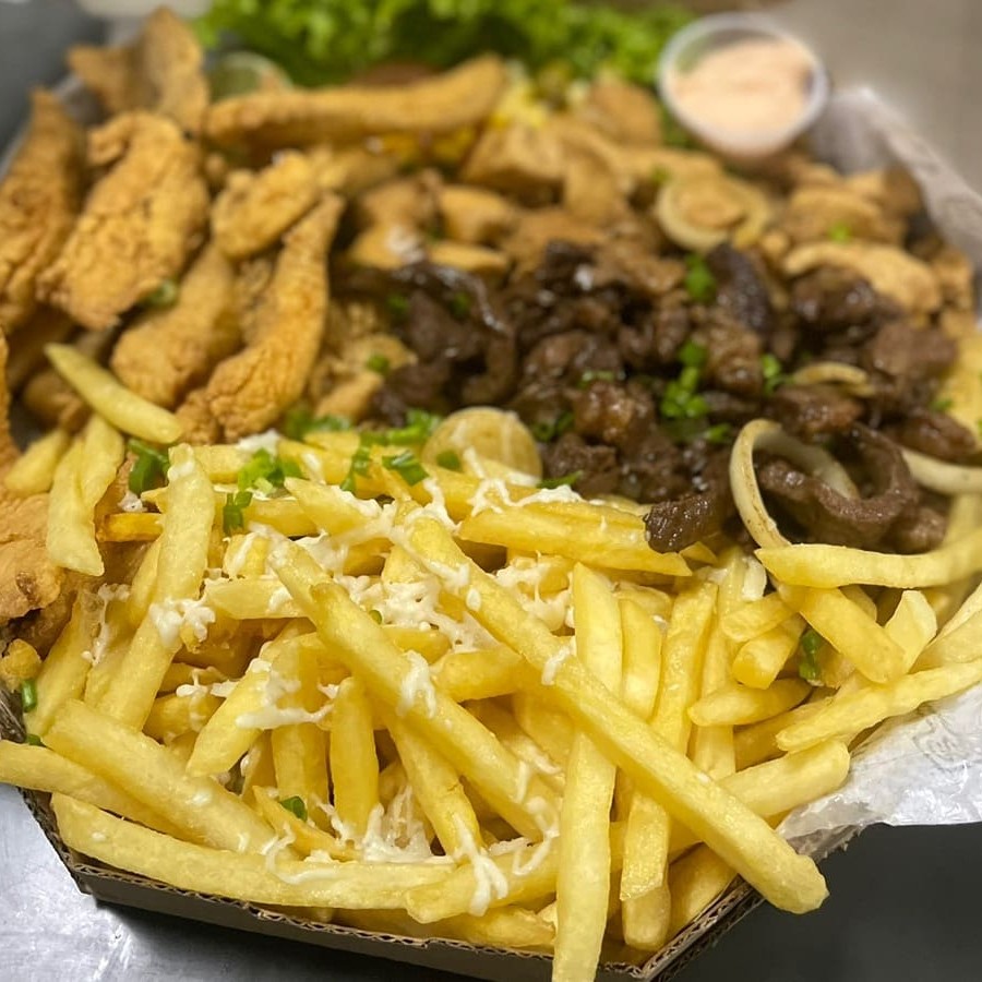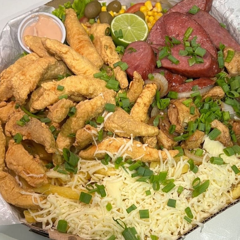 Filé de Tilápia empanada, Lombo Acebolado, Linguiça Calabresa, Fritas, Queijo Muçarela, Salada, Molho Barbecue e Molho Rosé da Casa.