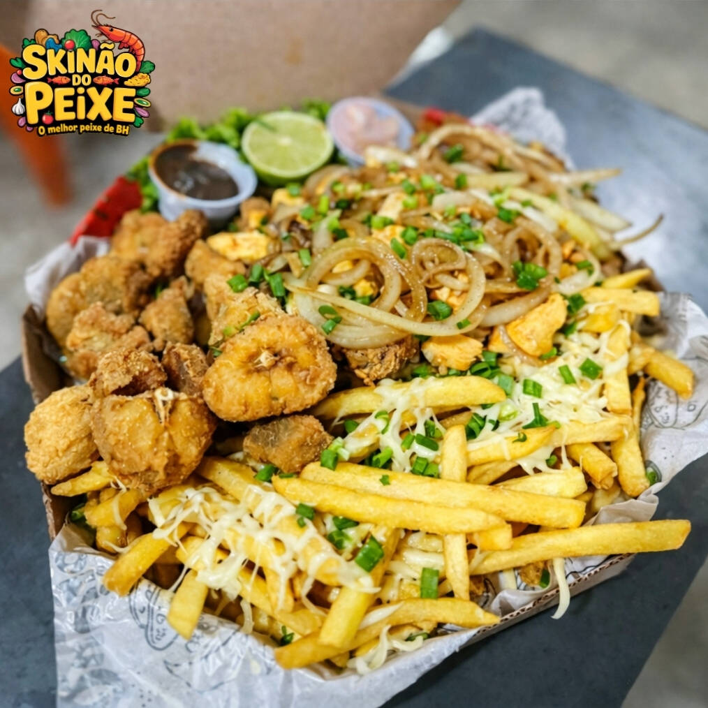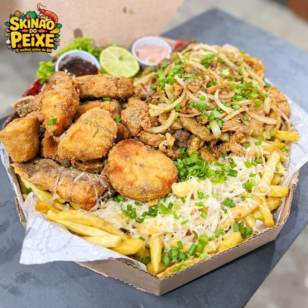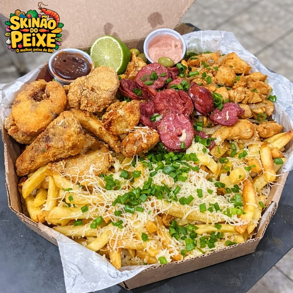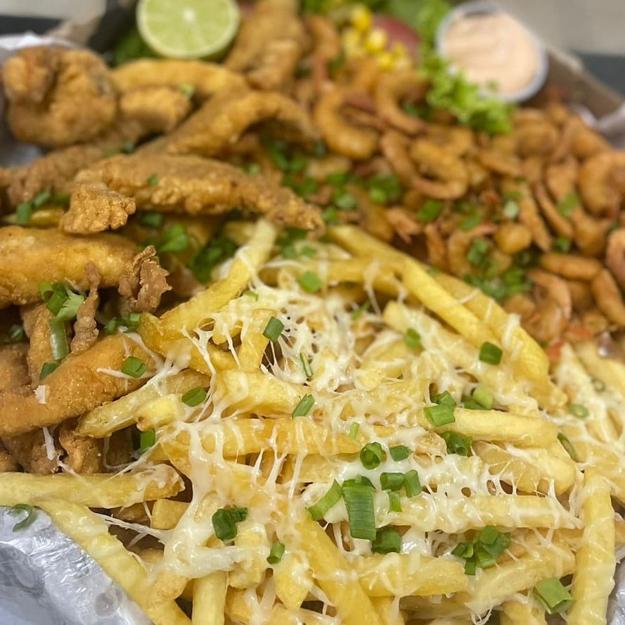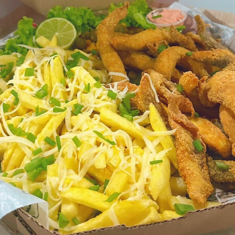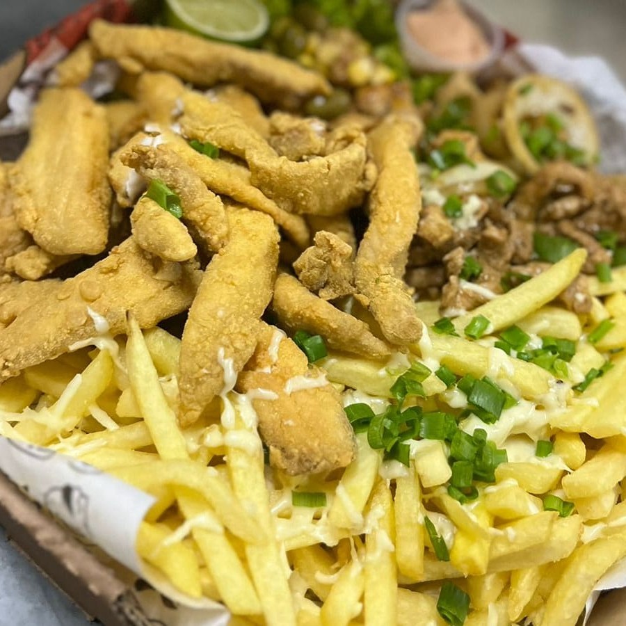Filé de Tilápia Empanada, Camarão Empanado, Contra Filé Acebolado, Linguiça Calabresa, Lombo Acebolado, Frango Acebolado, Fritas com Queijo Muçarela, Salada, Molho Barbecue e 2 Molhos da Casa + Bacon Grátis.
