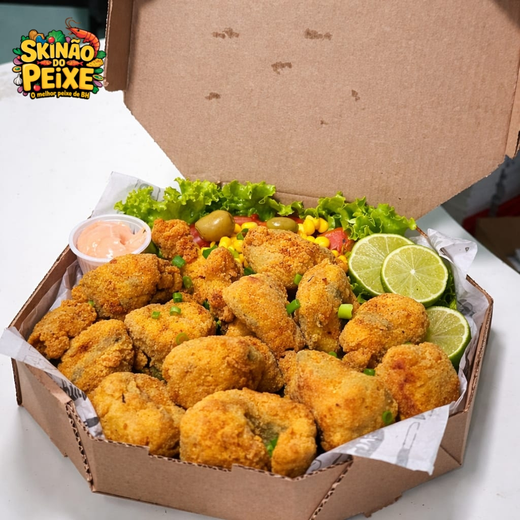 Filé de Tilápia Empanada, Cascudo Empanado, Camarão Empanado, Fritas, Queijo Muçarela, Salada e 2 Molhos Rosé da Casa