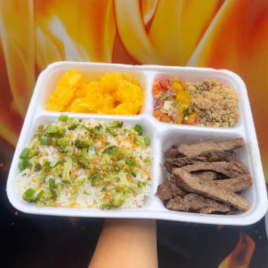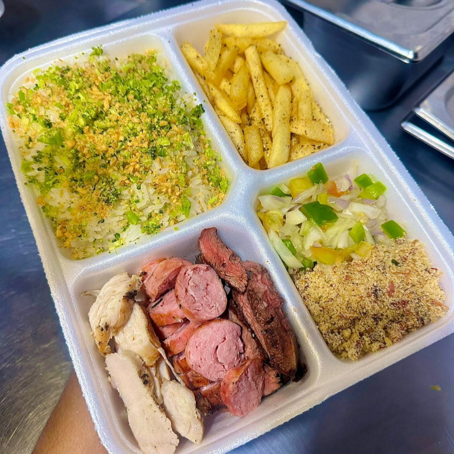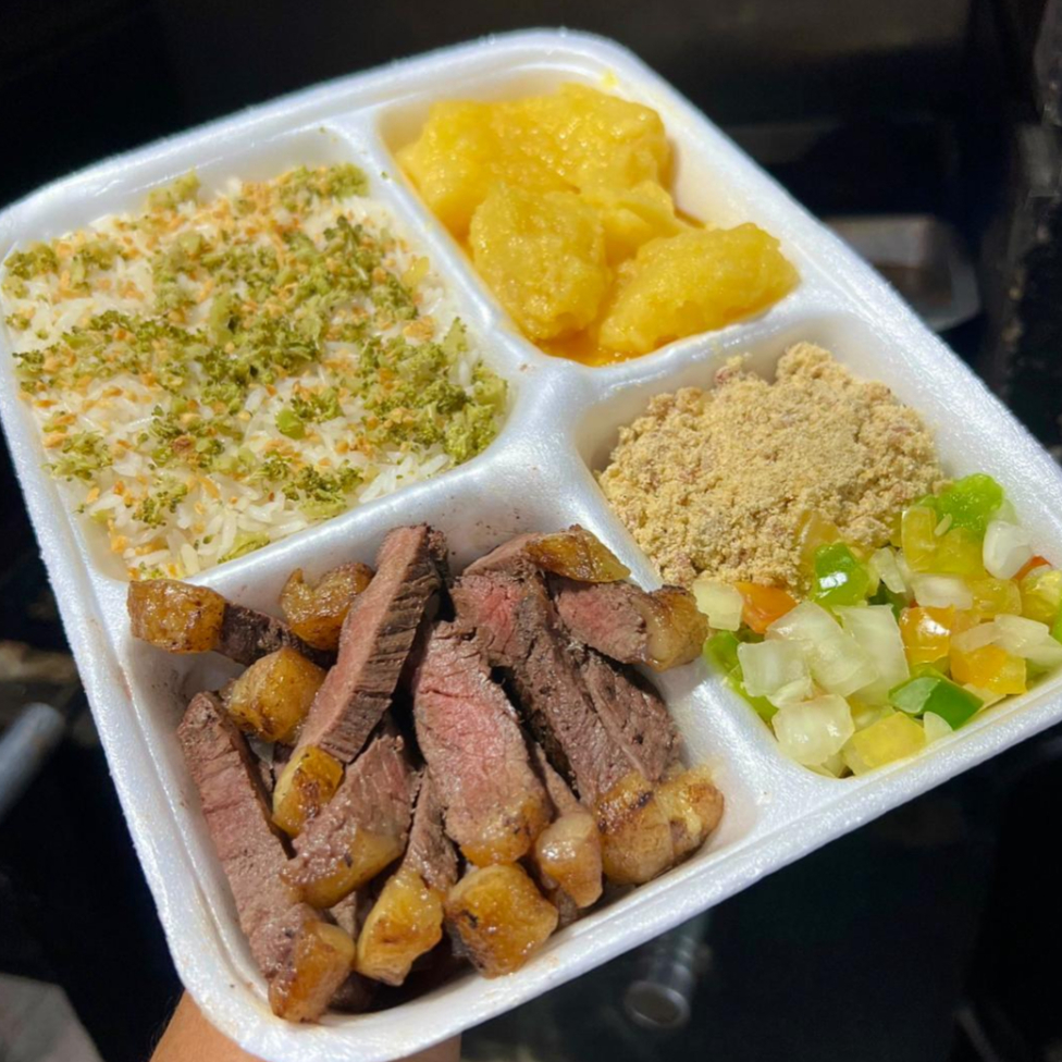 Arroz com alho dourado e brócolis, 160g de Contra Filé Grill, fritas ou mandioca na manteiga de garrafa, vinagrete e farofa temperada .