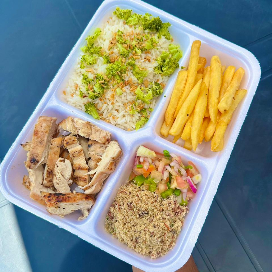 Arroz com alho frito dourado e brócolis, filé de frango grelhado na brasa, fritas ou mandioca na manteiga de garrafa, acompanhado de vinagrete e farofa temperada.