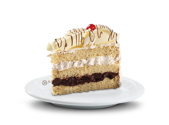 Bolo de massa de chocolate, recheios de mousse de chocolate e trufado de chocolate ao leite, cobertura de mousse de chocolate, raspas de chocolate ao leite, calda de chocolate e cerejas decorativas.