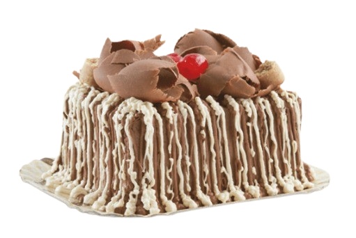 Bolo de massa de chocolate, recheios de mousse de chocolate e trufado de chocolate ao leite, cobertura de mousse de chocolate, raspas de chocolate ao leite, calda de chocolate e cerejas decorativas.