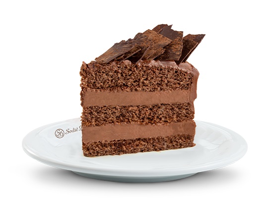 Bolo de massa integral sabor chocolate, recheio de trufado de chocolate ao leite aerado zero adição de açúcares, cobertura de mousse de chocolate, calda de chocolate zero adição de açúcares, placas de