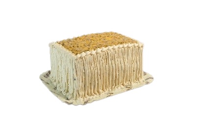 Bolo de massa branca integral, recheio de mousse de leite em pó zero açúcar, cobertura de mousse de leite em pó zero açúcar, decorado com raspas de chocolate branco baixo em açúcares e finalizado com