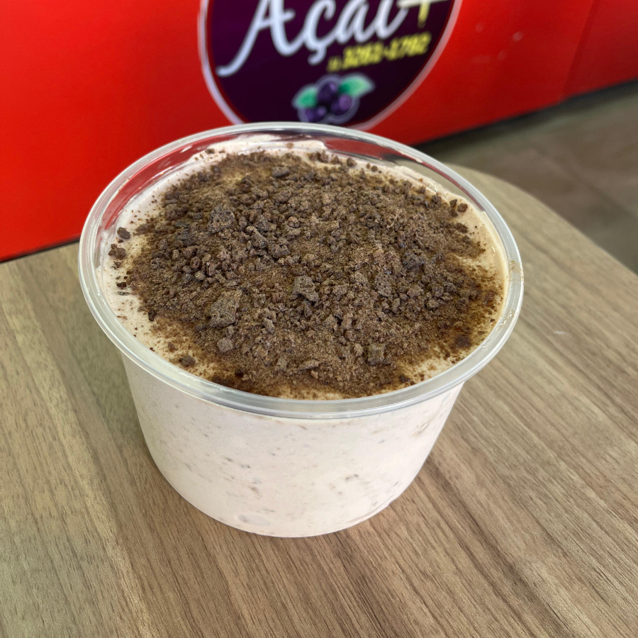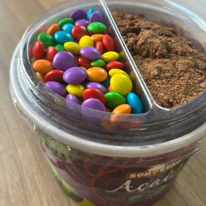 Delicioso e super cremoso! O seu açaí perfeito! Pote de 380 ml de creme de açaí,Já inclui 2 toppins , Chocoball e Confete.
