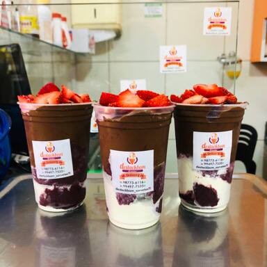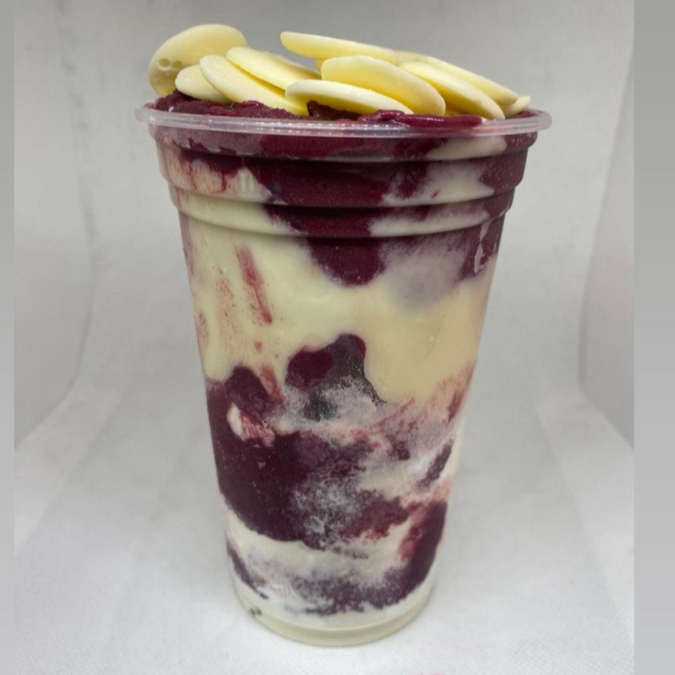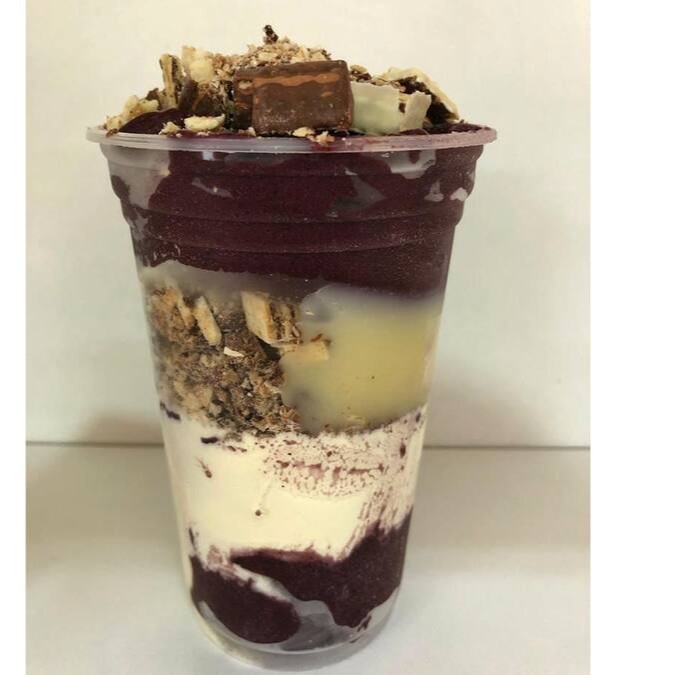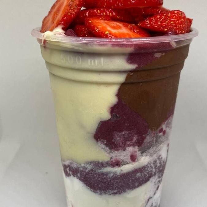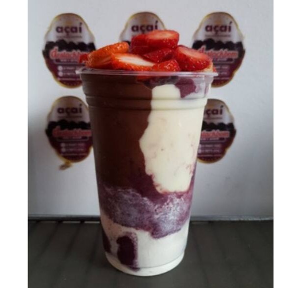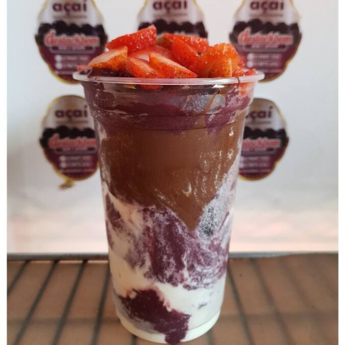 Açaí, Gotas de Chocolate (preto ou branco), Leite em Pó e Cobertura de Morango