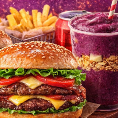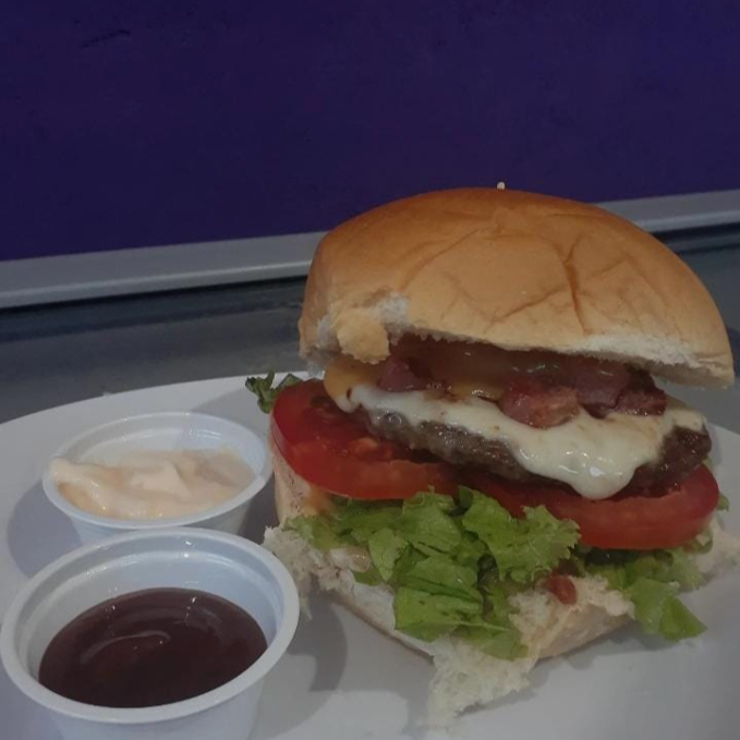 Pão , carne, queijo , bacon, ovo , molho especial, alface , tomate e cebola roxa