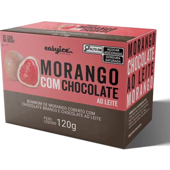Bombom de sorvete Easyice sabor doce morango coberto com chocolate.