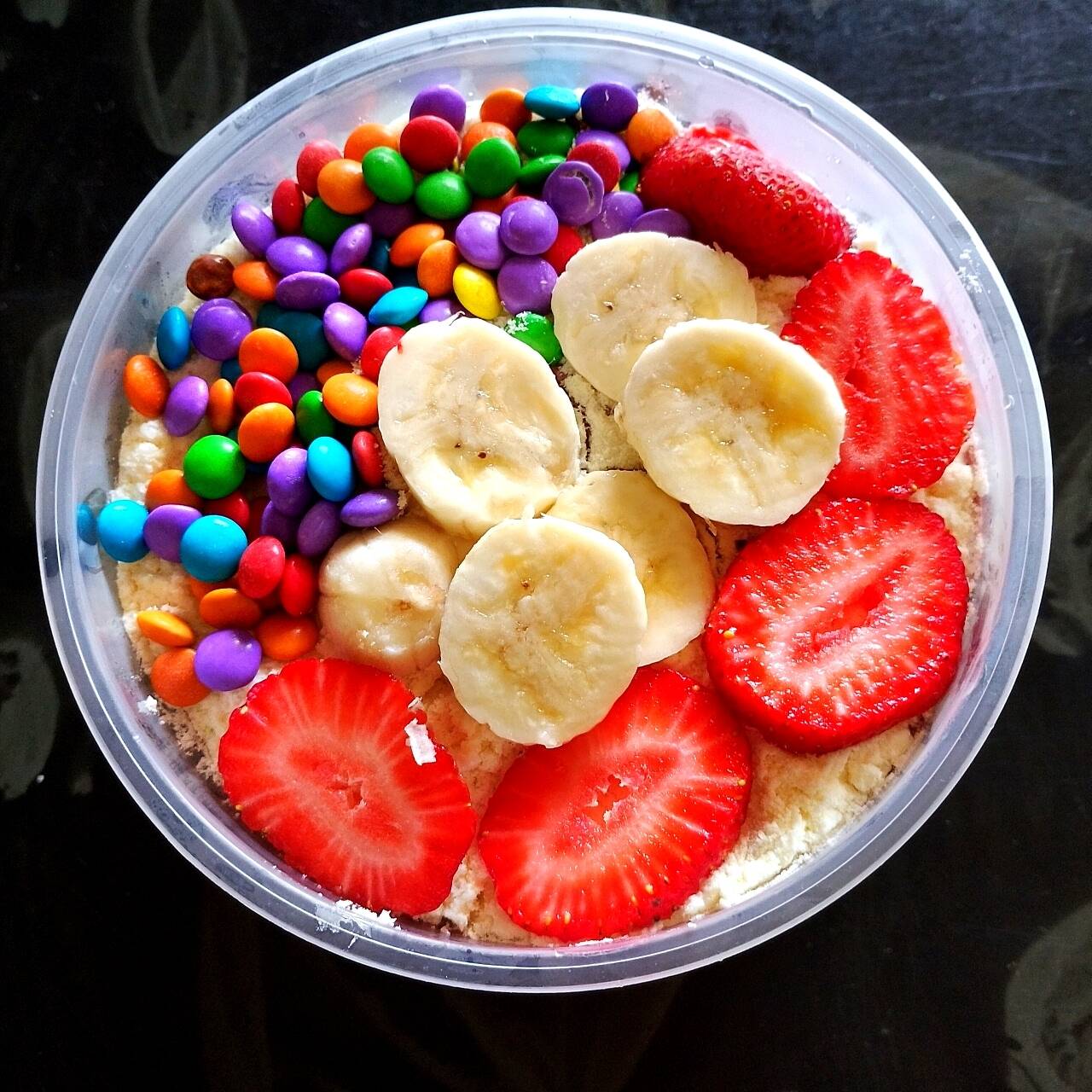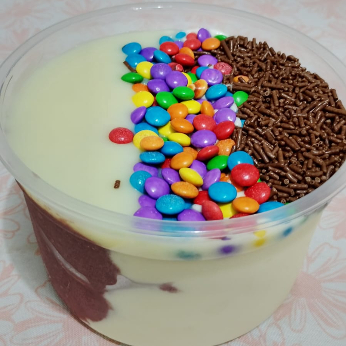 Confete de mms,granola,paçoca de amendoim,banana,morango,leite em pó,cobertura.