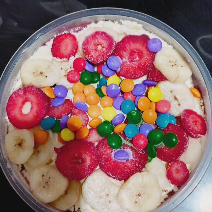 Confetes de mms,morango,banana,granola,paçoca de amendoim,,leite em pó,cobertura.