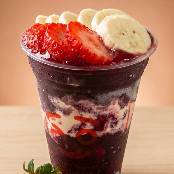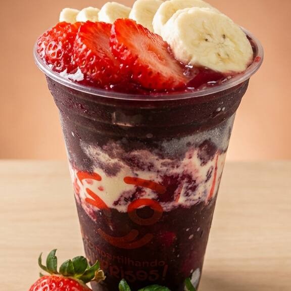 Cremoso e delicioso, feito com açaí, leite em pó e creme de Ninho, finalizado com banana e morango.