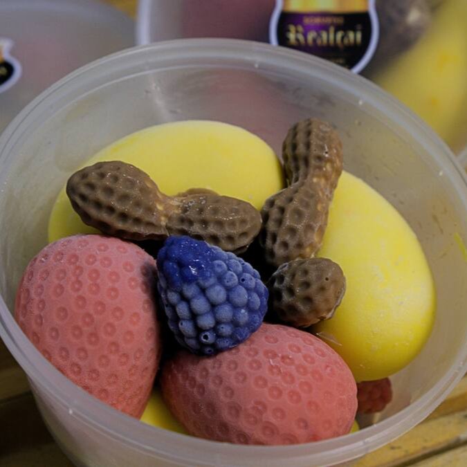 2 bananas, 3 Uvas, 2 Framboesas, 2 Mangas, 2 Morangos e 3 Amendoins.